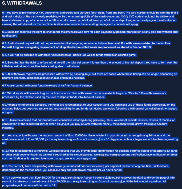 Baloo.bet kan je account sluiten en winsten schrappen op basis van een eigen label zoals bonusmisbruik