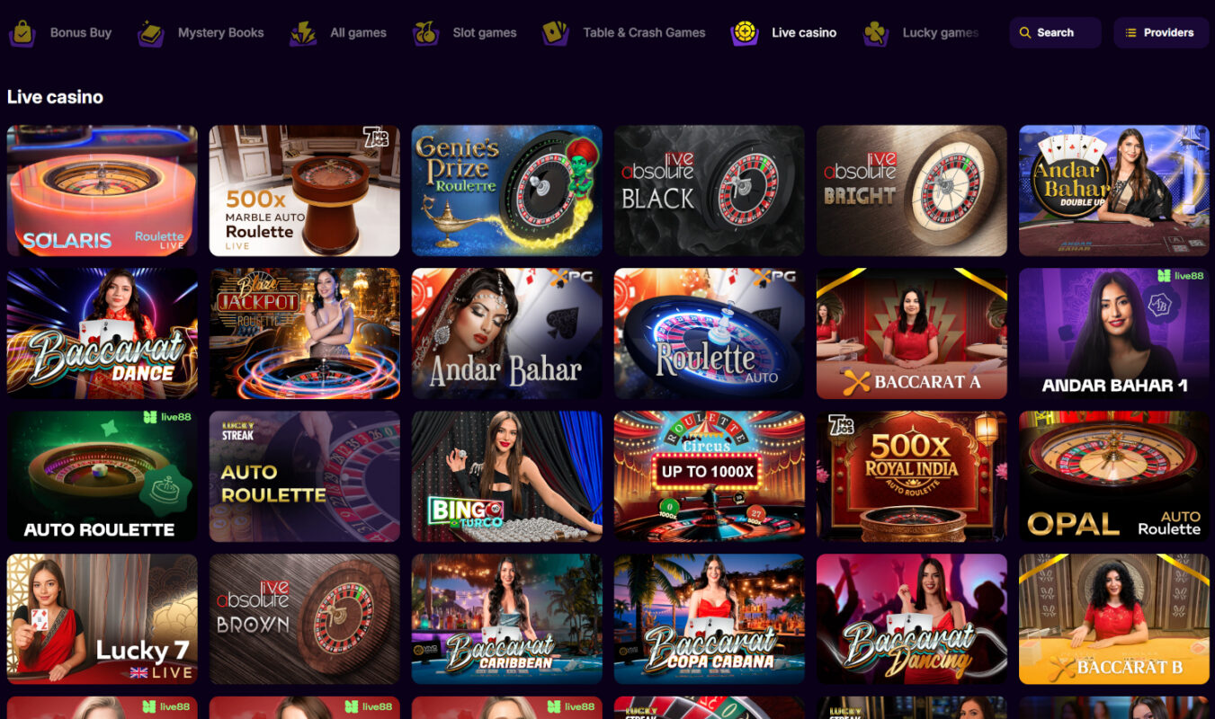 Het live aanbod wordt ingevuld door providers als Absolute Live Gaming, Live Games, Live88, Lucky Streak, Playtech, Vivo Gaming en XPG. Grote namen zoals Evolution Gaming, Playtech, Pragmatic Play en Stakelogic ontbreken, iets wat je bij niet vergunde goksites vrijwel altijd terugziet.
