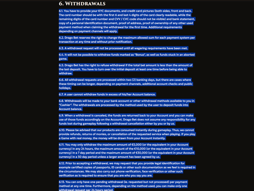 Drago Bet koppelt opnames aan verplichte wagering. In 5.6 staat dat een storting 3 keer moet worden rondgespeeld voordat je kunt opnemen. In 6.5 staat ook dat ze een opname mogen weigeren als je totale inzet lager is dan je laatste storting en dat je minimaal 1 keer moet omzetten. In 6.3 staat dat een opname niet verwerkt wordt tot aan de wagering requirements is voldaan. Samen betekent dit dat je geld in de praktijk kan vastzitten zolang zij vinden dat je nog niet genoeg hebt rondgespeeld.