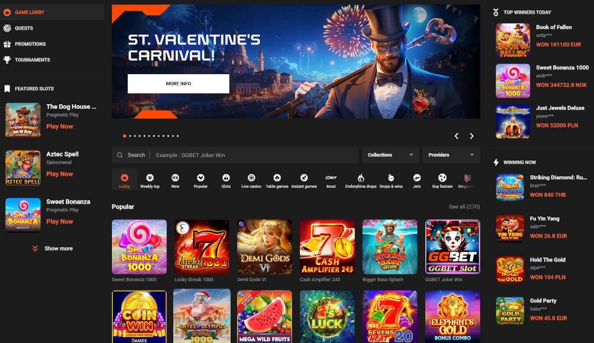 De casino-sectie is eenvoudig te vinden in het hoofdmenu onder ‘Casino’. Eenmaal daar heb je toegang tot handige subcategorieën zoals: Lobby, Weekly TOP, New, Popular, Slots, Live Casino, Table games, Instant games, InOut, Endorphina, Drop & Winss, JetX, Buy Feature, Megaways, Poker, Roulettes en Mystery Lady Quest.
