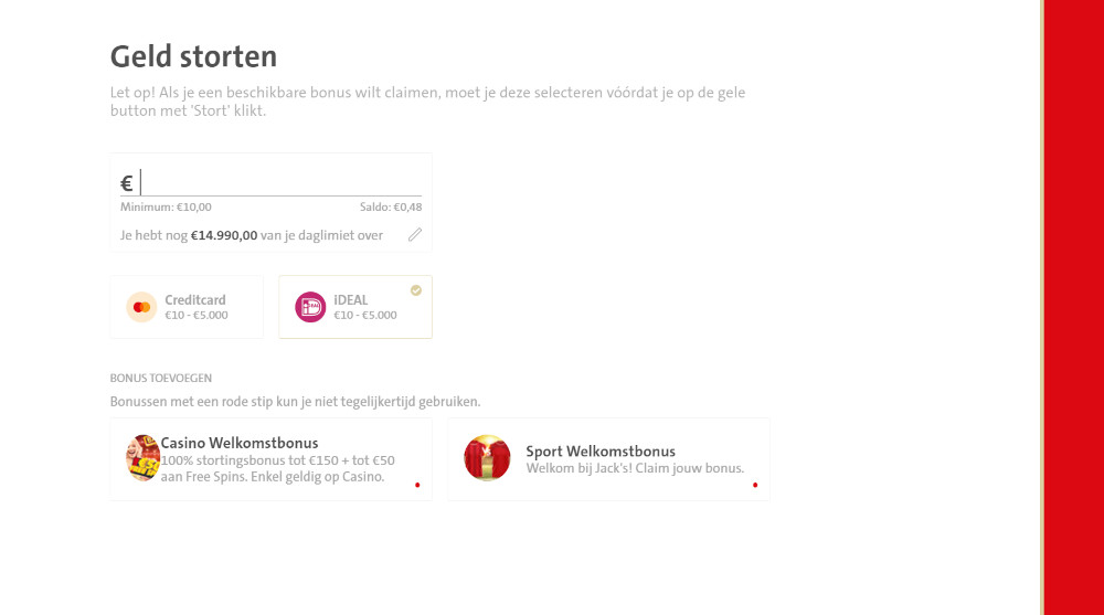 Er zijn bij Online Jacks Casino de volgende stortingsmethoden beschikbaar: iDEAL, Mastercard, Visa, Maestro en bankoverschrijvingen.