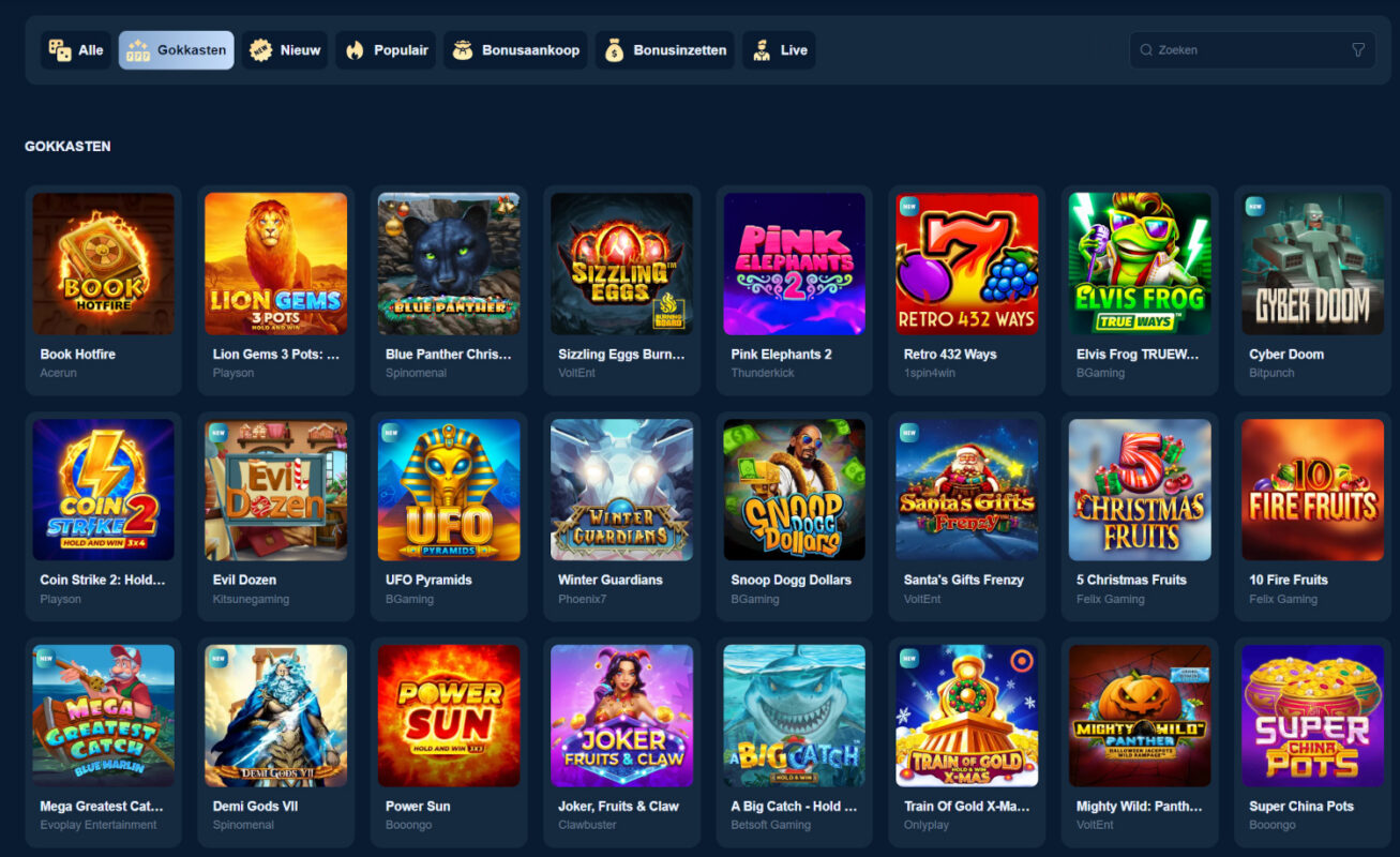 Daarnaast kan je ook filteren op categorie, echter zijn deze niet heel logisch en nagenoeg nutteloos op de bonus wagering na: Alle, Gokkasten, Nieuw, Popular NL, Bonus Buy NL, Bonus Wagering NL & Live.
