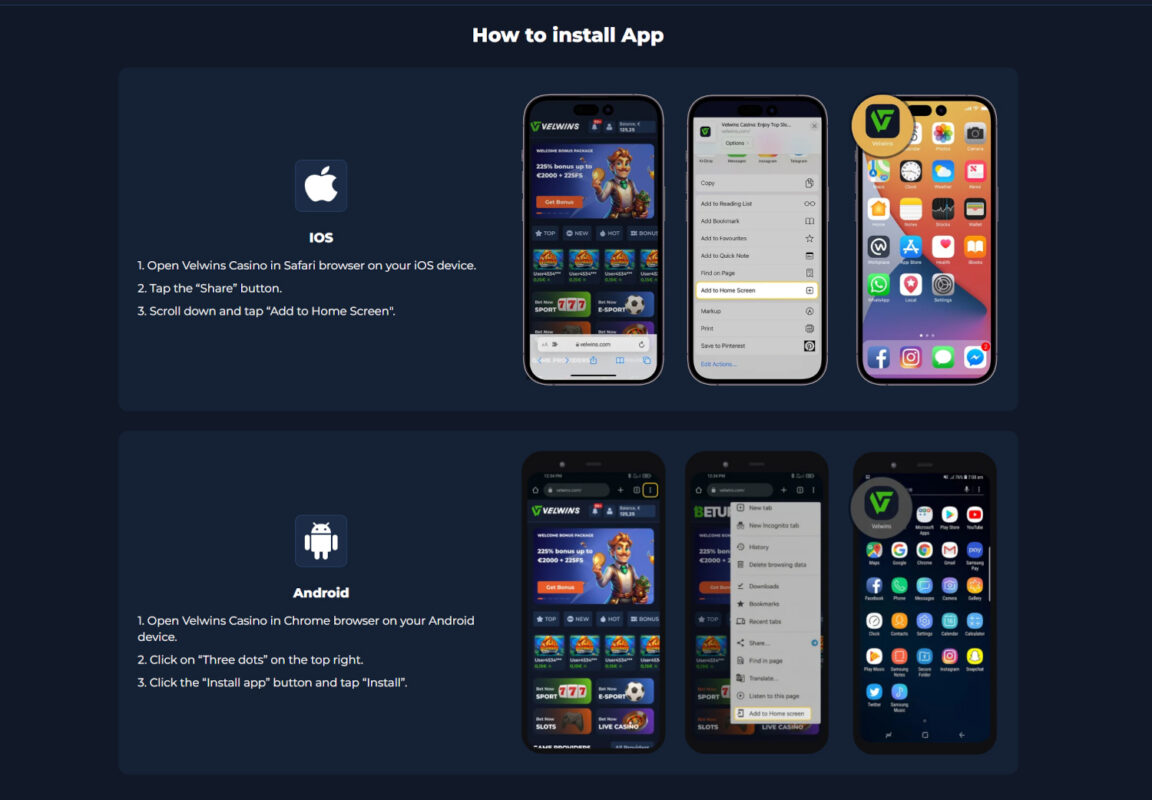 Velwins.vip heeft op dit moment geen echte casino app die je kunt downloaden via de App Store of Google Play. Soms wordt er toch gesproken over een “app”, maar in de praktijk gaat het om een snelkoppeling die je toevoegt aan je startscherm.