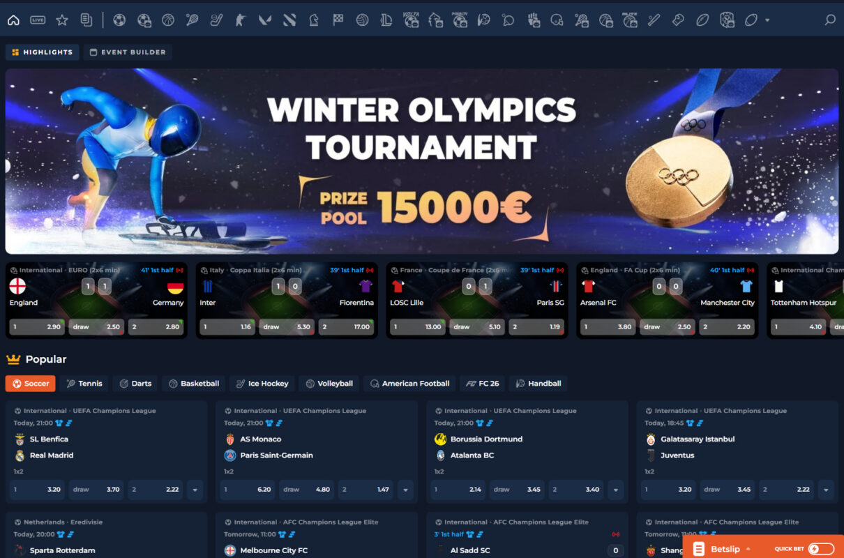 Daar vind je een duidelijke indeling met vijf vaste onderdelen: Home, Live, Favorites, My Bets en Search, vaak aangevuld met een Event Builder & Highlights. Die opzet werkt prettig, omdat je makkelijk schakelt tussen live wedstrijden, je opgeslagen favorieten en je openstaande tickets.
