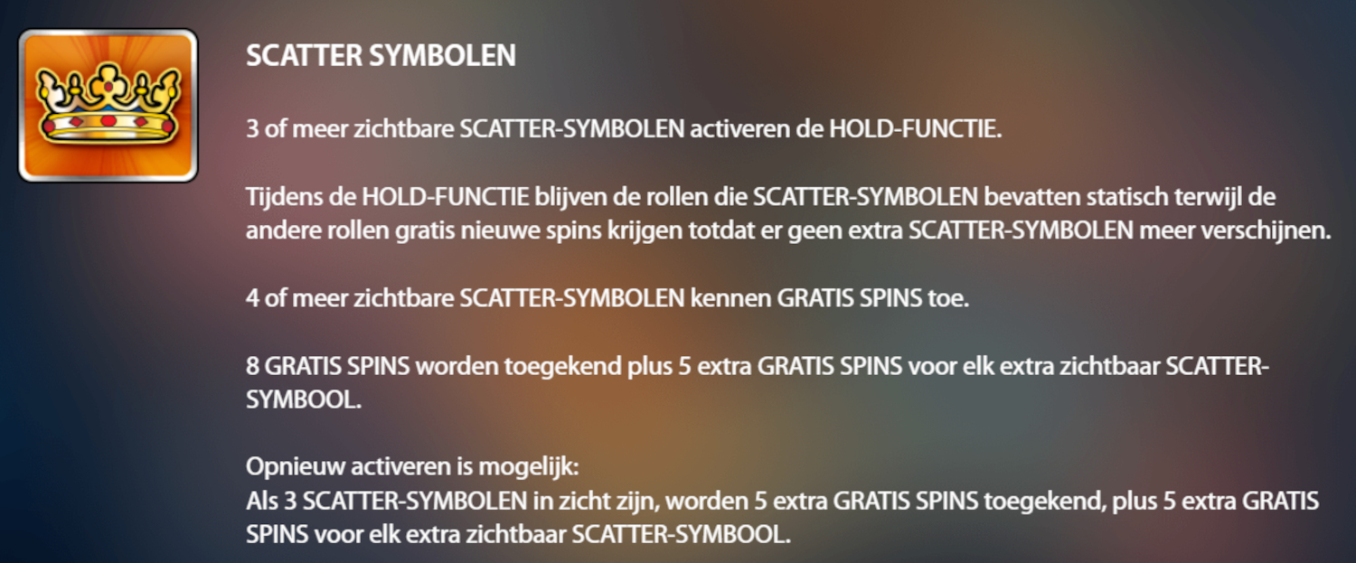 Let op: In de free spins verandert de hold regel. Daar is al twee of meer scatters genoeg om de hold functie te activeren.
