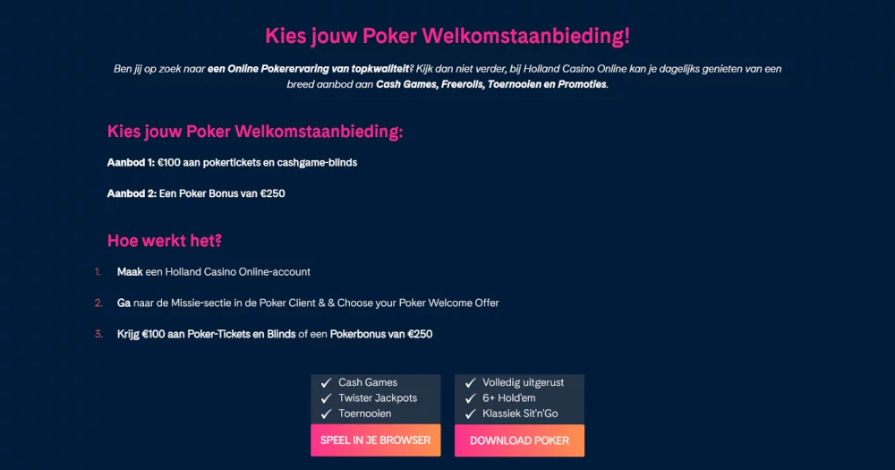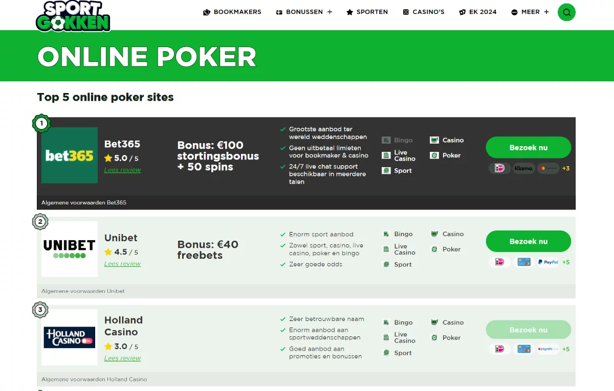 Deze pagina biedt je alle essentiële informatie om te starten met online poker, inclusief legale pokerrooms met een vergunning van de Kansspelautoriteit, gedetailleerde uitleg en handleidingen over de spelregels, en de aantrekkelijkste welkomstbonussen en promoties.